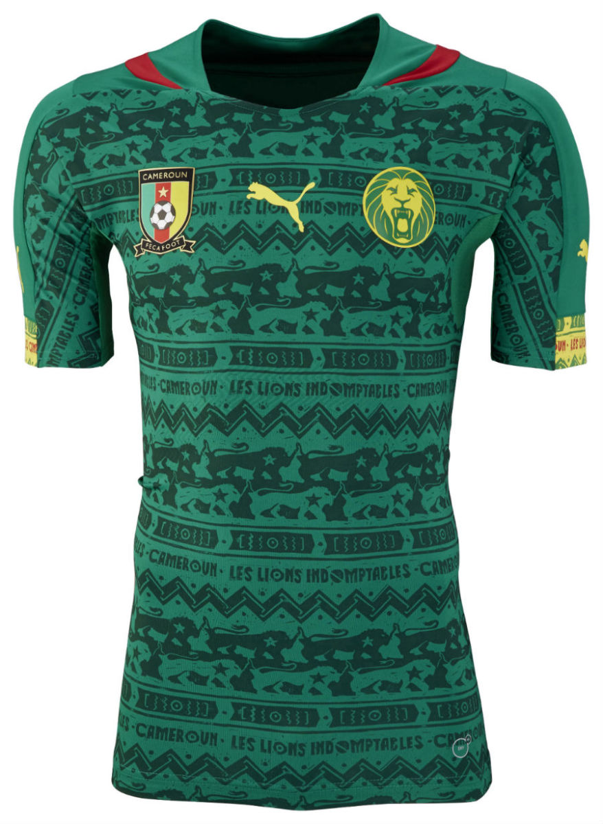 That black graphic print overlaid across the entire Cameroon home green comes from the national team's nickname, the Indomitable Lions. The print features a lion, the country shape of Cameroon, stars from the country’s flag and a football field graphic. While not as wild, the away kit isn’t exactly subtle, a fully yellow shirt with red accents and a roaring green lion emblem.