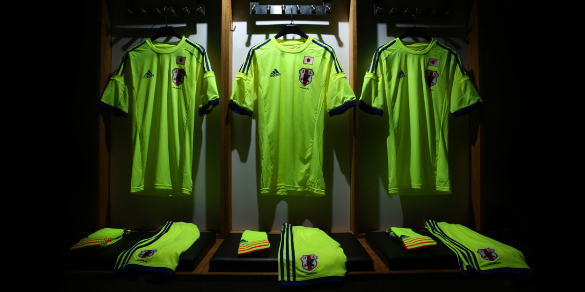 The deep blue of Japan’s home kit features 11 lines spreading out from the emblem and national flag to symbolize “Enjin,” or the act of going into a huddle. But about that away uniform, that same Enjin design gets bright in a new neon yellow, a head-to-toe look that will stand out in Brazil.