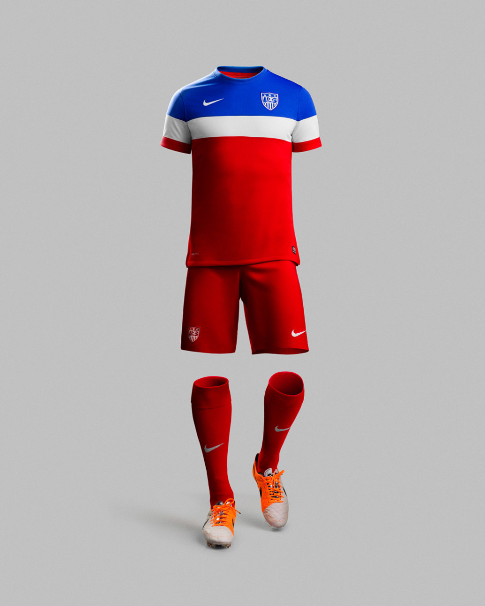 The home and away looks of the U.S. national team couldn’t offer a starker contrast. The home white kit goes all white, save for faint gray pinstripes and a slight red trim, and offers a white polo collar. A new angular font gives a bit of additional personality to the classic look. There’s nothing classic, except for the American flag, of course, about the new away kit, a crew-neck jersey with three horizontal bands mirroring the colors of the flag. The upper torso and top of the sleeves, which houses the team crest on the chest, feature blue. A white chest band extends over the middle of both sleeves while the remainder of the top is red. Red continues for the shorts and socks.