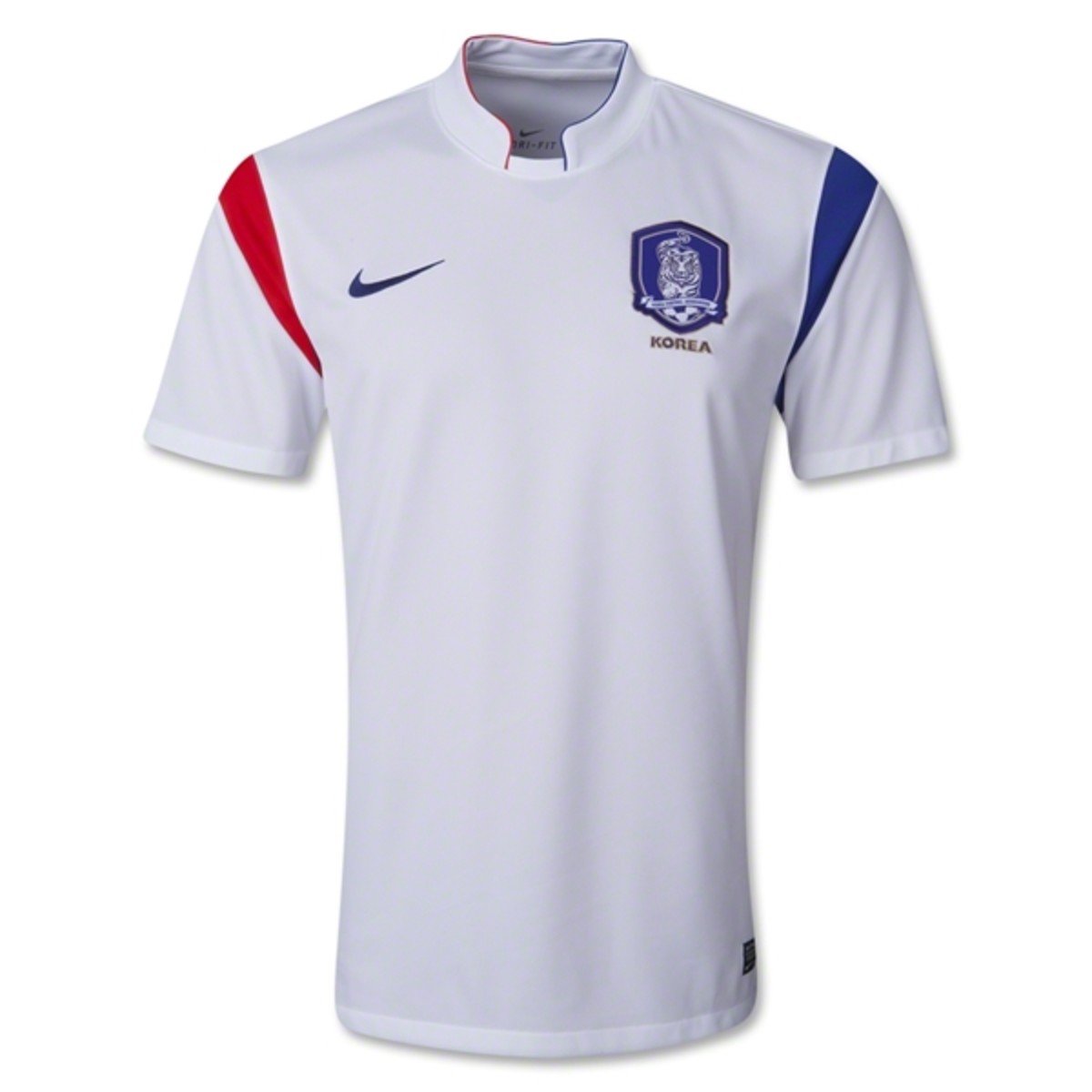 Playing off the yin and yang circle symbol found at the center of the Korean flag, the red Korean jersey has those interlocking shapes at the top of each sleeve in blue.