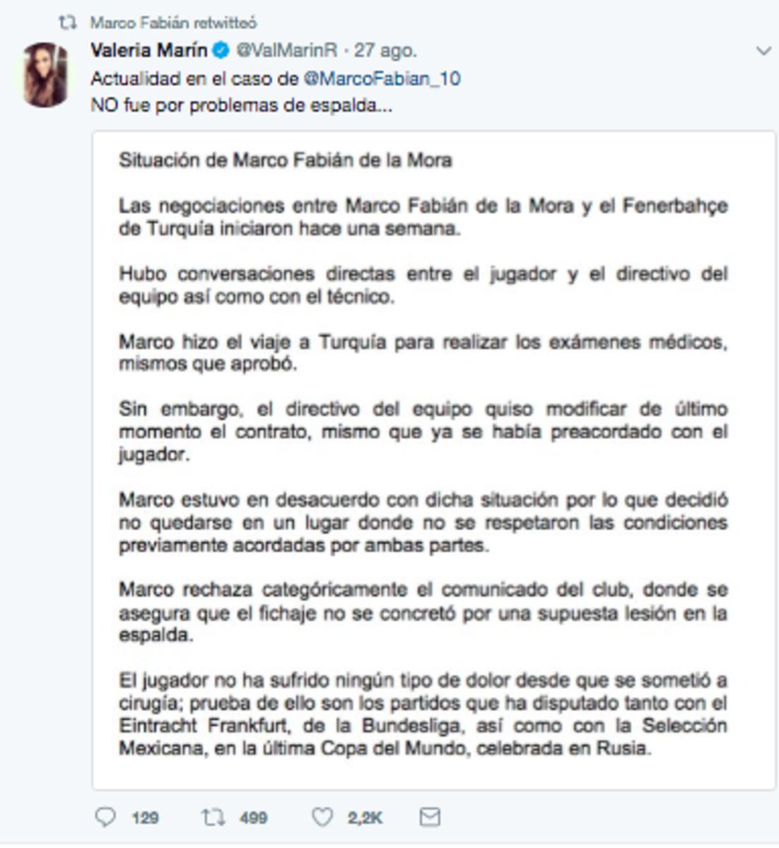 El jugador azteca replicó un comunicado de la periodista de Fox Sports, Valeria Marín, donde informa que Fabián está completamente sano y que no se había cerrado su traspaso con la escuadra turca, quienes no respetaron el tema económico pactado.