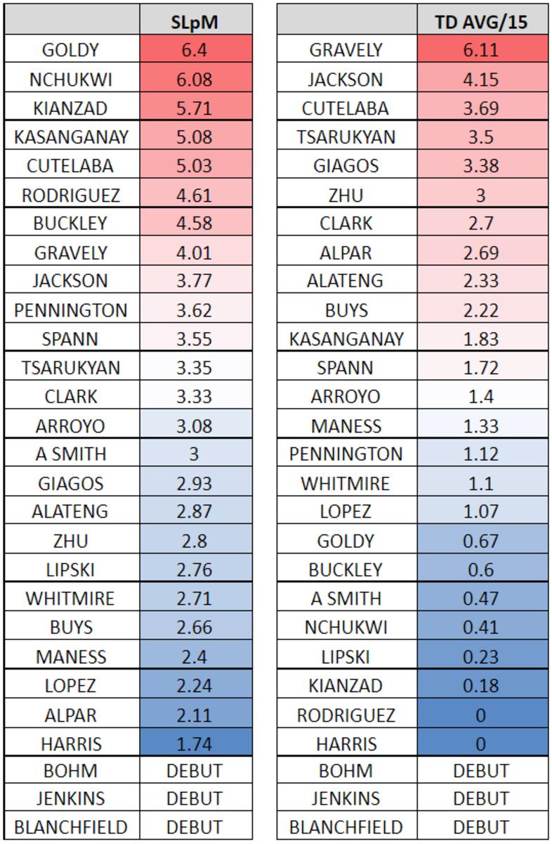- Fighters that typically press the action, land takedowns, and/or high finish rates matched up against those that get finished, roster. (see my charts above)