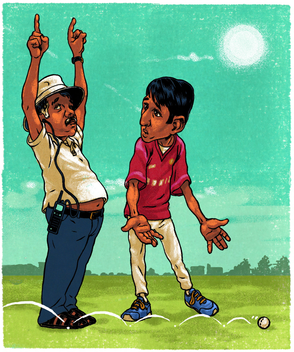 But when they retook the field for the second game, things got strange. Sometimes a batter swung and missed but one of the two on-field umpires, after consulting his walkie-talkie, would raise both hands to signal a six, the cricket version of a home run. Other times the official told a bowler to loop the ball slowly, so it could more easily be dispatched into the long grass beyond the field’s spray-painted boundary line. “We didn’t like it,” Thakur told me. “I was made the captain, but I never took part in any decision.”