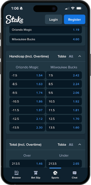 You can see a small sample of this in the comparison image below. In an NBA game between the Milwaukee Bucks and Orlando Magic, Stake has slightly better odds at 1.86 for Orlando -10.5 than BetMGM at 1.84 (converted from -118 American odds). The platform’s margins hover around 3-6% on most major sports and betting markets, especially soccer, basketball, and tennis.