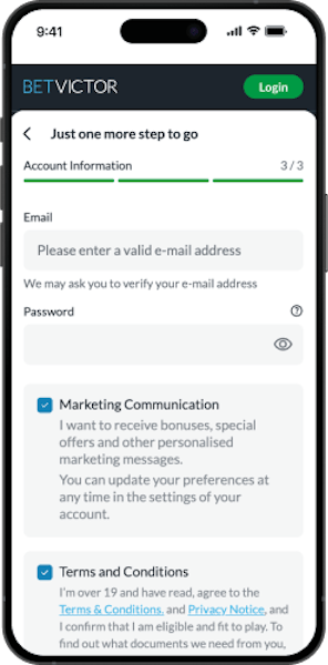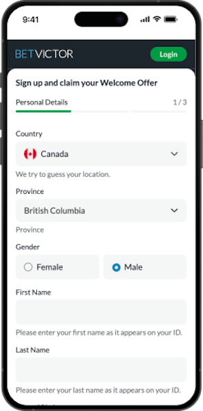 Head to BetVictor.com or click our link to begin the sign-up process. Alternatively, you can download the BetVictor app, a leader among Canada betting apps, from the Google Play Store or Apple App Store.