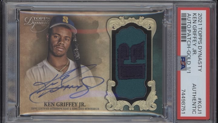Why It's So Valuable: This card checks so many boxes. There are only 10 copies in existence. It has a striking green color-match design that mirrors Griffey’s Mariners jersey. Additionally, the PSA 9 grade makes this the highest graded copy of this card in existence. This prestigious Essentials Credentials card has all the ingredients to make this the most valuable Ken Griffey Jr. baseball card in the world.