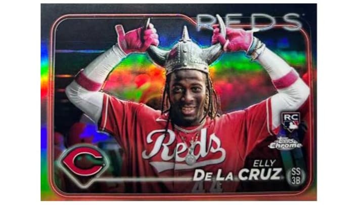 The Topps 2024 Chrome Jasson Dominguez base card shows him swinging a bat, his SP card shows him sitting down using a cell phone, and his SSP card shows him signing autographs. Some SPs and SSPs will show an oversized head on the player while others are on purpose error cards. There are also inserts that are considered SP cards, such as the "Let's Go" insert in Topps Chrome.