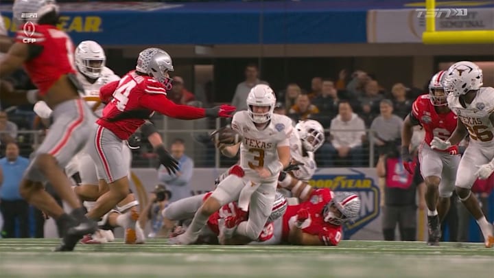 Midway through the third quarter, with Texas trailing 14–7 and facing a crucial 3rd-and-10, Longhorns quarterback Quinn Ewers made an incredible play. Inches away from getting sacked, Ewers tossed the football to running back Quintrevion Wisner, who picked up 14 yards and moved the chains on the heads-up play.