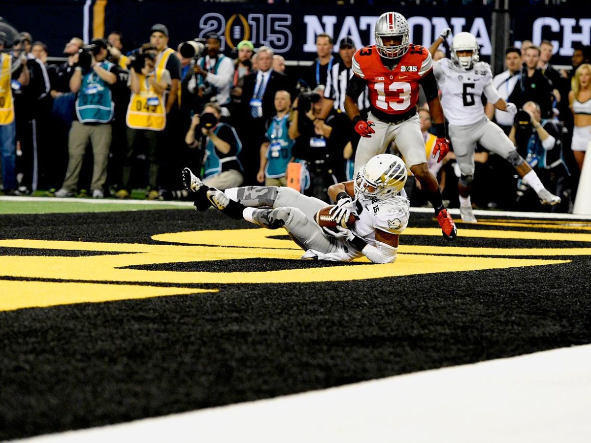 Oregon wide receiver Keanon Lowe catches a touchdown pass for the first score in the National Championship game.