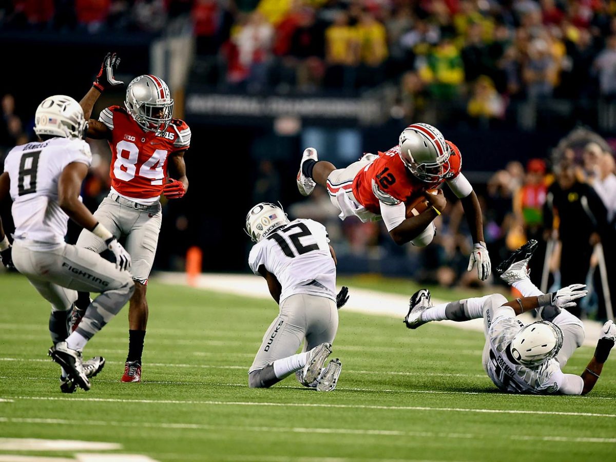 Ohio State quarterback Cardale Jones leaps over two Oregon defenders. Jones ran for 38 yards on 21 carries in the Buckeyes' 42-20 win.