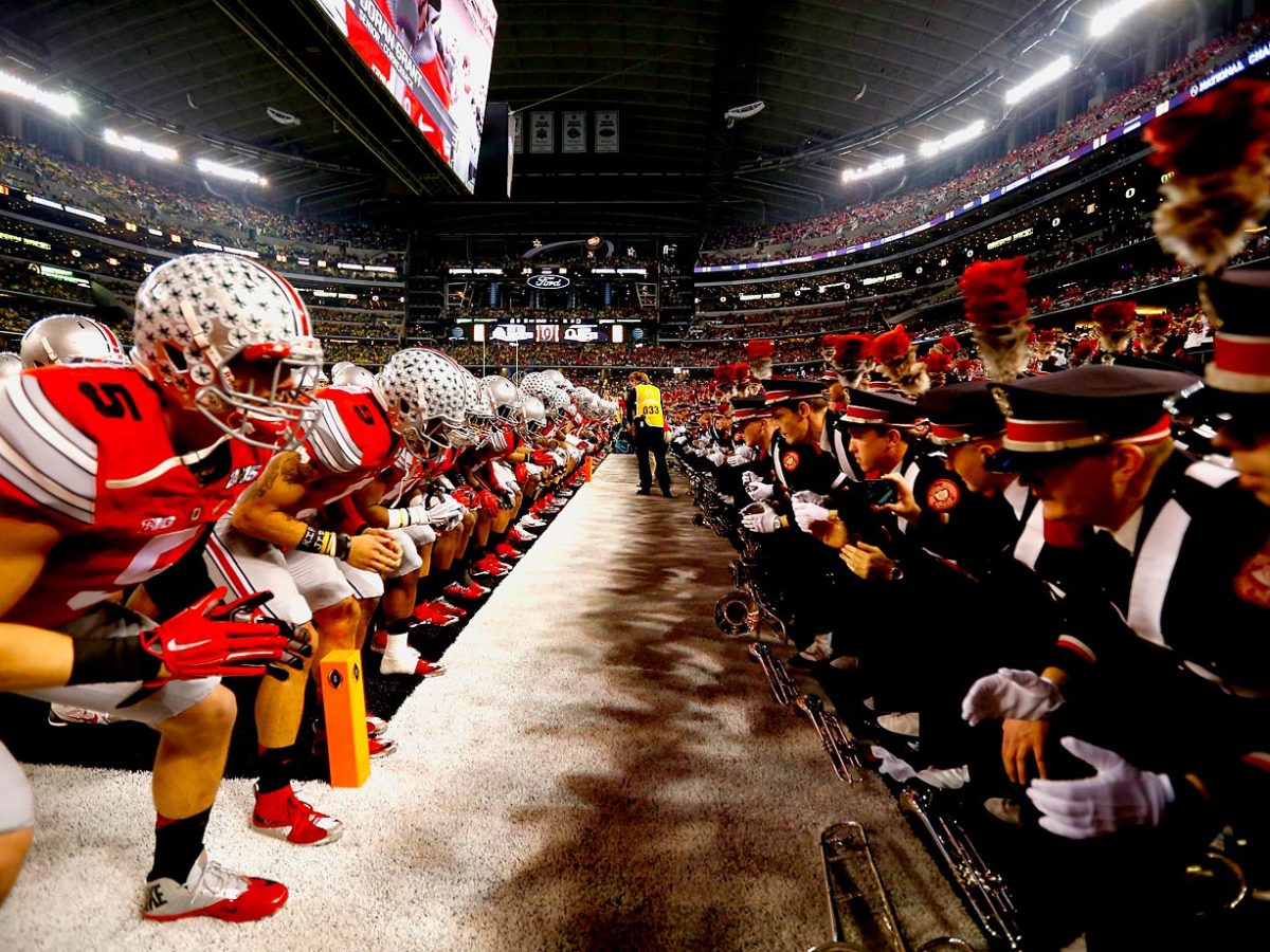 Ohio State Buckeyes players line up across the school's marching band before the start of the National Championship game.