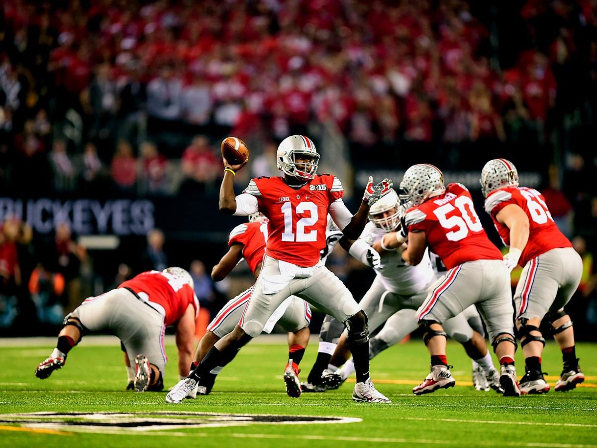 Ohio State quarterback Cardale Jones prepares to throw in the face of three Oregon defensive linemen. Jones completed 16 of his 23 passes during the Buckeyes' 42-20 win.