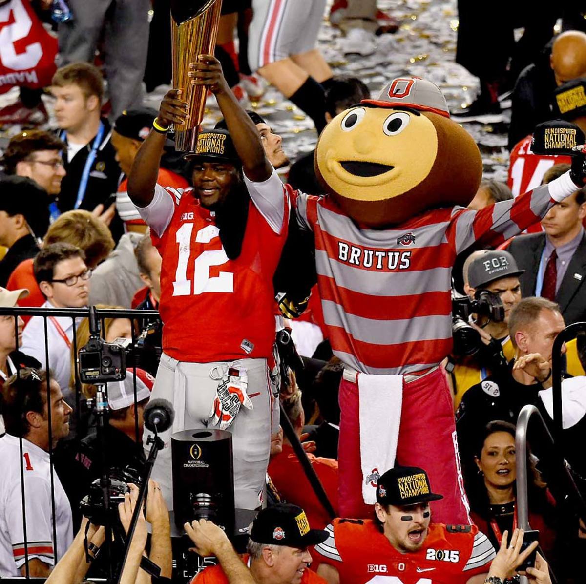 Ohio State quarterback Cardale Jones celebrates with the Buckeyes' mascot after his team's 42-20 win over Oregon in the National Championship game at AT&T Stadium in Arlington, Texas, Jan. 12, 2015.