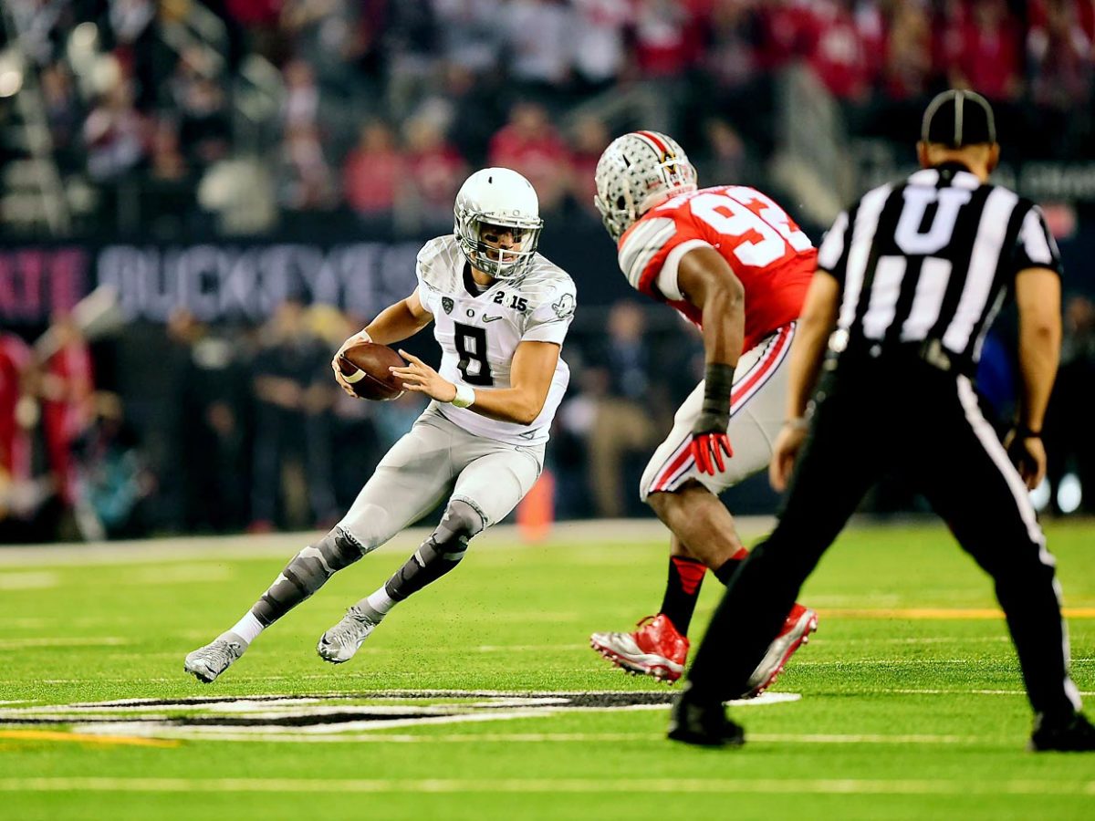 Oregon quarterback Marcus Mariota tries to evade Ohio State defensive lineman Adolphus Washington. Mariota threw for 333 yards in the Ducks' loss.