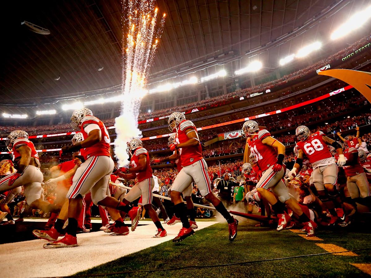 Ohio State players run out onto the field before the start of the first ever College Football Playoff National Championship game.