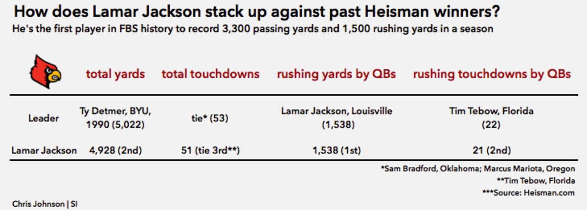 All Jackson needed to do was turn that potential into production. The first test, a home date with Conference USA also-ran Charlotte, was a breeze. Jackson shredded the 49ers with 405 yards of total offense and eight touchdowns. He followed that up by roasting Syracuse the next week, but one sequence within that game legitimized his campaign in a way no statistic could. On an option play late in the second quarter, Jackson scampered from the pocket, approached an Orange defensive back and leapt over him without making contact before jogging into the end zone. It was a stunning distillation, in NBA scouting parlance, of Jackson’s bounce that doubled as the most breathtaking Heisman moment any player had delivered to that point of the season.