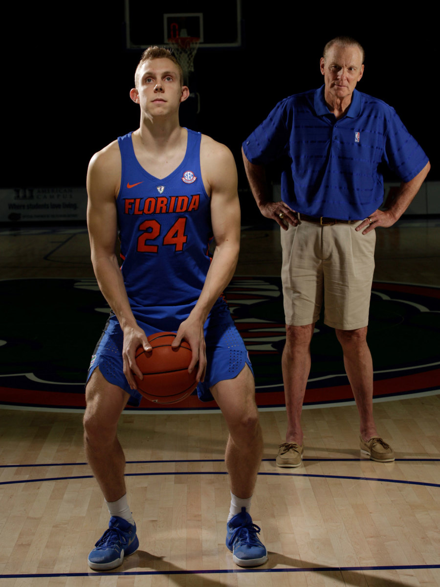 Like many stories about the Barry basketball family, this one begins with Rick. And he’s right where you’d expect to find him—at the free throw line. It’s an early evening in late January, and Rick and Lynn Barry have walked onto the court at Florida’s Stephen C. O’Connell Center for a photo shoot with their son, 6' 6" Canyon, a senior guard with the Gators. While the photographer assembles his gear, Lynn leads Rick to the charity stripe. “You haven’t shot in a few months,” she says. “I don’t want you to hurt your back. And I don’t want you to miss too many.”