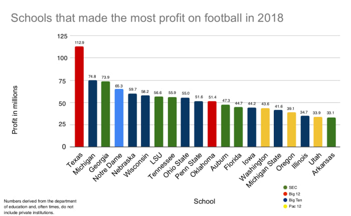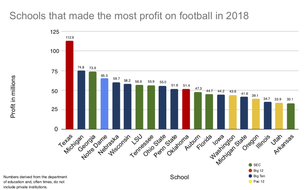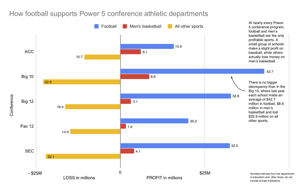 This isn’t exclusive to LSU. In fact, Power 5 public universities made an average of $28.2 million in profit last year on football, according to self-reported financial documents SI examined. The discrepancy between football and all other sports is severe across the country. Even in the basketball-crazed ACC, football outperforms hoops. The average ACC football program made $15.9 million, while the average basketball school pulled in $6.1 million. Among the 65 Power 5s and Notre Dame, just four schools had a men’s basketball team make more than its football team: Syracuse, Duke, Kentucky and Louisville.