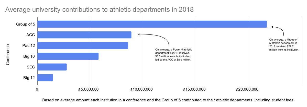 While Power 5 programs heavily lean on football revenues, those in smaller divisions, the Group of Five, are reliant on state and institution support. In fact, the average G5 school got $21.7 million in athletic aid last year from its university, while that number among Power 5 schools was $5.5 million. In many cases, school funding is responsible for more than half of a Group of Five’s athletic budget. Even the richest G5 schools, like Houston, UCF and Cincinnati, got at least $28 million last year from their schools. “So many Group of Fives depend on enrollment. If that reduces, it’s a hit,” says Eddie Nuñez, the New Mexico athletic director. “It’s a hit for this [fiscal] year and next year.”
