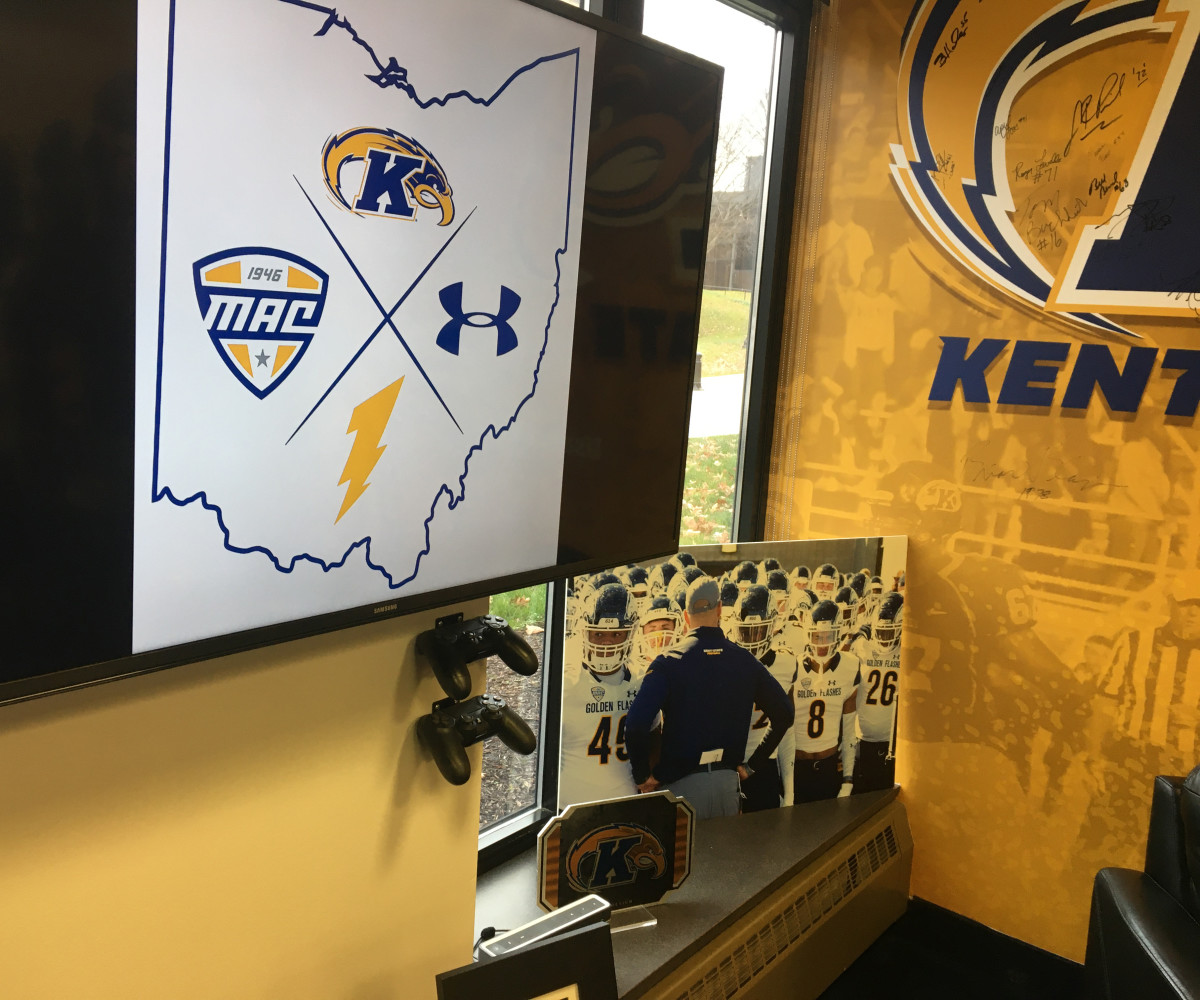 The sticks, two of them, are clipped against his office wall, beneath a PlayStation 4 tucked behind a television screen. The sticks are what bonds coach and player, what connects recruiter and recruit. The sticks bring together everyone here inside Lewis’s cozy office at Kent State.