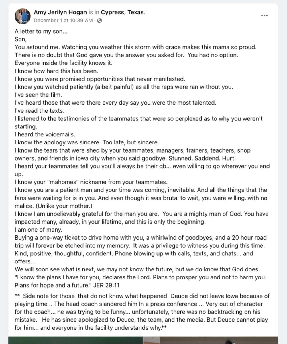 "Deuce did not leave Iowa because of playing time... The head coach slandered him in a press conference," she wrote in a Facebook post on Wednesday. "Very out of character for the coach... he was trying to be funny... unfortunately, there was no backtracking on his mistake. He has since apologized to Deuce, the team, and the media. But Deuce cannot play for him... and everyone in the facility understands why."