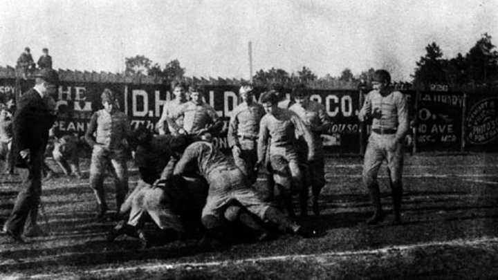 At the time, the game was actually a hybrid of soccer and rugby, and better resembled an organized riot compared to what football is today. Also, uniforms were basically a heavy sweater (which would have been nearly impossible to wear in the summer months due to the heat and humidity, and at minimum extremely uncomfortable), padded pants and no helmets.