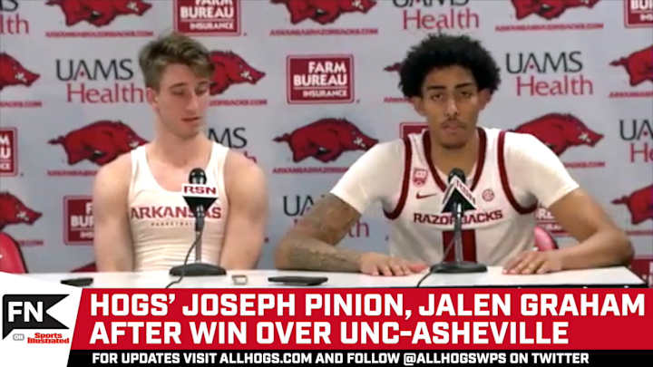 Joseph Pinion, Jalen Graham After Win Over UNC AshvilleJoseph Pinion and Jalen Graham talk dominating performance in win over UNC-Asheville on Wednesday night, Dec. 21, 2022, at Bud Walton Arena in Fayetteville, Ark.Sports Illustrated All Hogs News, Analysis and More|Share on FacebookShare on XAdd us on Loading recommendations... Please wait while we load personalized content recommendationsPublished Dec 22, 2022SPORTS ILLUSTRATED ALL HOGS NEWS, ANALYSIS AND MOREShare on FacebookShare on X