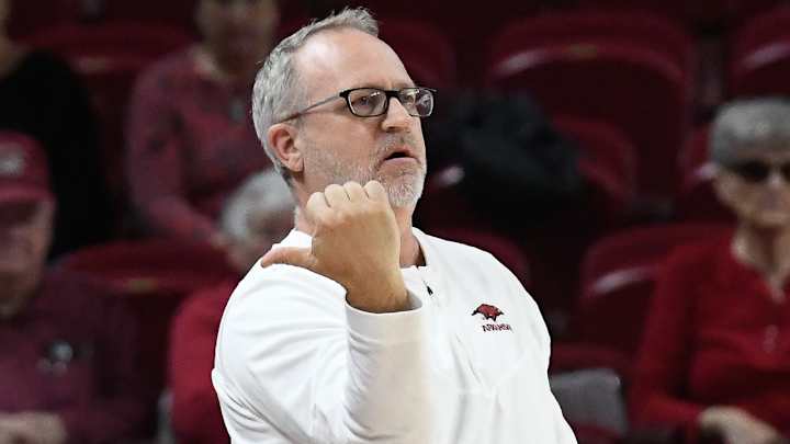 Arkansas Razorbacks coach Mike Neighbors with the media after getting a 74-72 win over the Auburn Tigers on Sunday evening at Bud Walton Arena in Fayetteville, Ark.