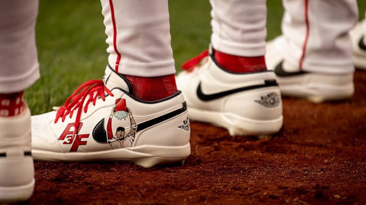 Frates’ “P3F” logo was also imprinted on the cleat, close to the toe. On the other cleat, a “Strike Out ALS” logo with a red ribbon was etched into the white shoe.