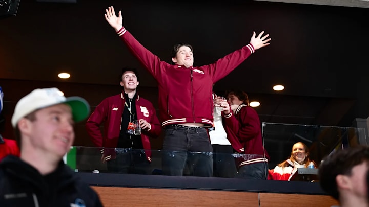 That was exactly the case for about half of the Eagles’ roster during Monday’s 2026 Beanpot Championship game against Boston University, as recent program legends Will Smith, Ryan Leonard, Gabe Perreault, and Jacob Fowler sat in a box at TD Garden to cheer BC on as it claimed a 6-2 triumph over its cross-town rival, the Terriers.
