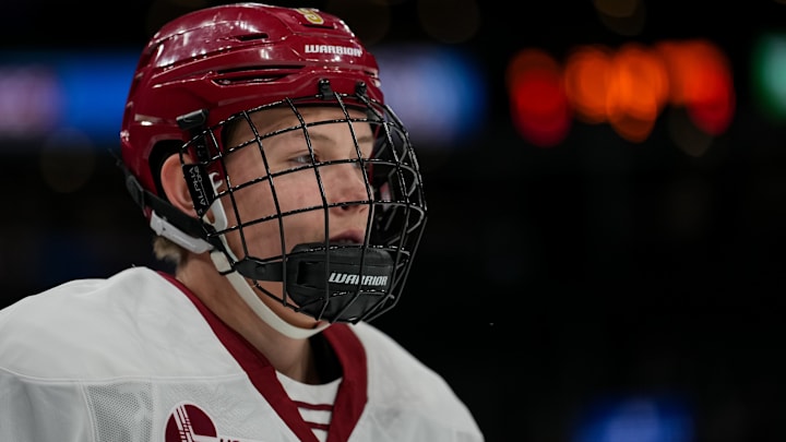 In Monday’s 5-1 Beanpot semifinals win over Harvard, he picked up two assists and was just as dangerous as any forward on the ice, further cementing his projection as a first-round pick in the 2026 NHL Draft.