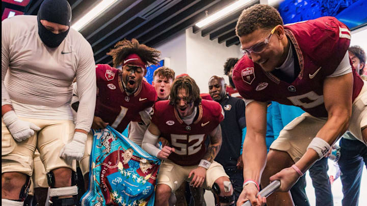 FSU football celebrates Wake Forest rout with Duce Robinson, Luke Petitbon breaking the rock