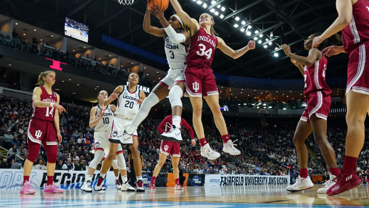 Mar 26, 2022; Bridgeport, CT, USA; UConn Huskies forward Aaliyah Edwards (3) and Indiana Hoosiers guard Grace Berger (34) work for the ball during the second half in the Bridgeport regional semifinals of the women's college basketball NCAA Tournament at Webster Bank Arena. Mandatory Credit: David Butler II-USA TODAY Sports