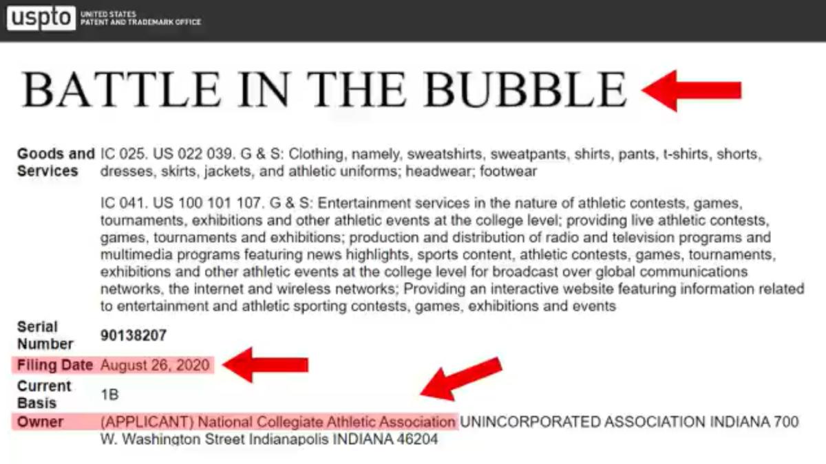 The filing was made on Aug. 26, and it suggests that the NCAA intends to use a bubble for potentially multiple sports, and the NCAA also intends to sell "Battle in the Bubble" branded clothing.