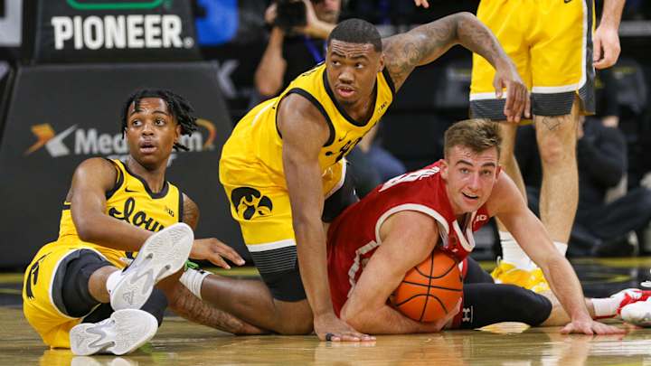 Iowa’s Dasonte Bowen (left) and Tony Perkins (center), and Wisconsin’s Tyler Wahl (5) look at an official for a call after scrambling for a loose ball during their game on Dec. 11, 2022 at Carver-Hawkeye Arena in Iowa City, Iowa. (Rob Howe/HawkeyeNation.com)