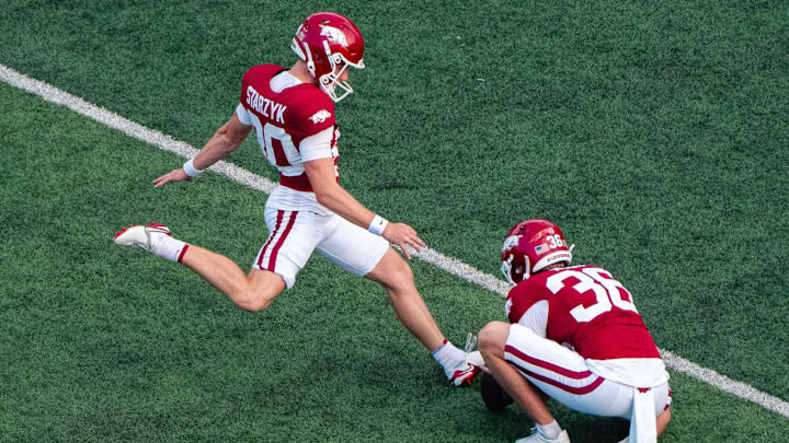As for Starzyk, LSU's new starting placekicker, he's coming off of a standout true freshman campaign for the Arkansas Razorbacks.