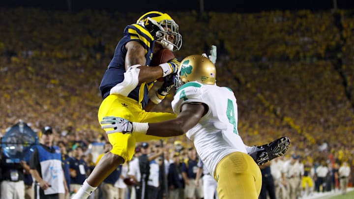 Back in 2011, Michigan hosted rival Notre Dame for its first-ever night game played in the Big House. The Irish were up 31-28 with just eight seconds left on the clock. But star quarterback Denard Robinson found Roundtree in the back of the end zone with two seconds remaining to make the Wolverines victorious over Notre Dame, 35-31 in an instant classic game.