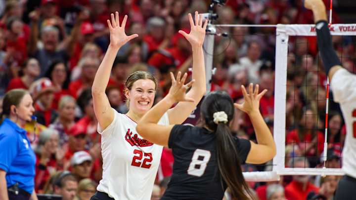 Lexi Rodriguez celebrates a kill for the Huskers.