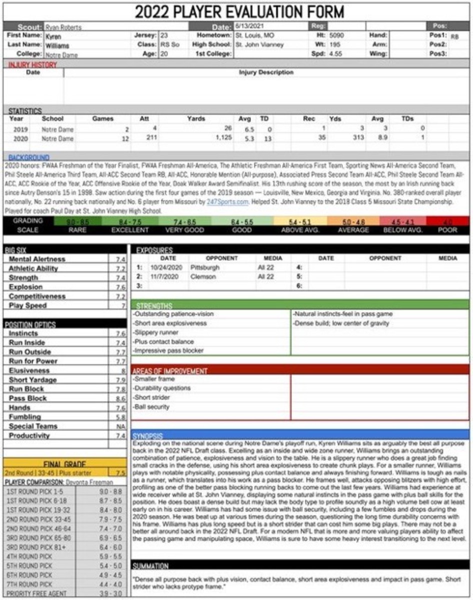 Even so, runners can overcompensate for lack of size when they excel in other areas. Short-area explosiveness stands out immediately when popping on Notre Dame film. “Give Williams an inch and he will take a mile.”