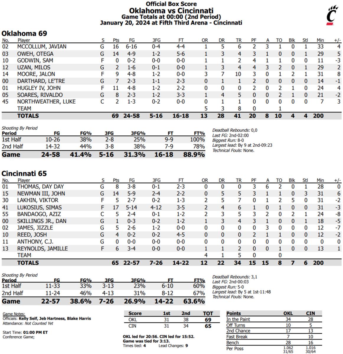 OU’s first road win since the conference slate pushed the Sooners to 15-3 overall and 3-2 in the Big 12, while the Bearcats fell to 13-5 overall and 2-3 in league play.