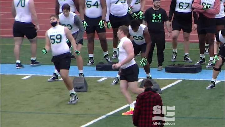 Watch class of 2023 Mount Pleasant (S.C.) Oceanside offensive tackle prospect Monroe Freeling work at the Under Armour Next All-America camp in the Atlanta area.