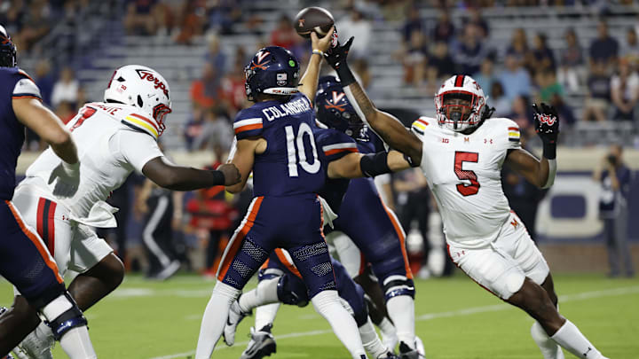 Let's start by addressing the injuries. Starting left tackle McKale Boley has yet to play a game this season as he continues to recover from an ankle injury. Dartmouth transfer Ethan Sipe broke his foot last week and is out for the season. UCF transfer Drake Metcalf, who was hoped to be back at some point this season, reaggravated his Achilles injury and is out for the year too. Virginia's depth on the offensive line is gone and it's starting to show. Colandrea made a few mistakes on Saturday night, but he also wasn't given a whole lot of time to throw as Maryland's pass rush was consistently getting to him within a second or two. He was sacked only once, but was hurried seven times and frequently had to throw the ball out of bounds. The offensive line has been a big problem for Virginia under Tony Elliott and it seems, perhaps mostly due to unfortunate injury luck, that may be the case again this season.