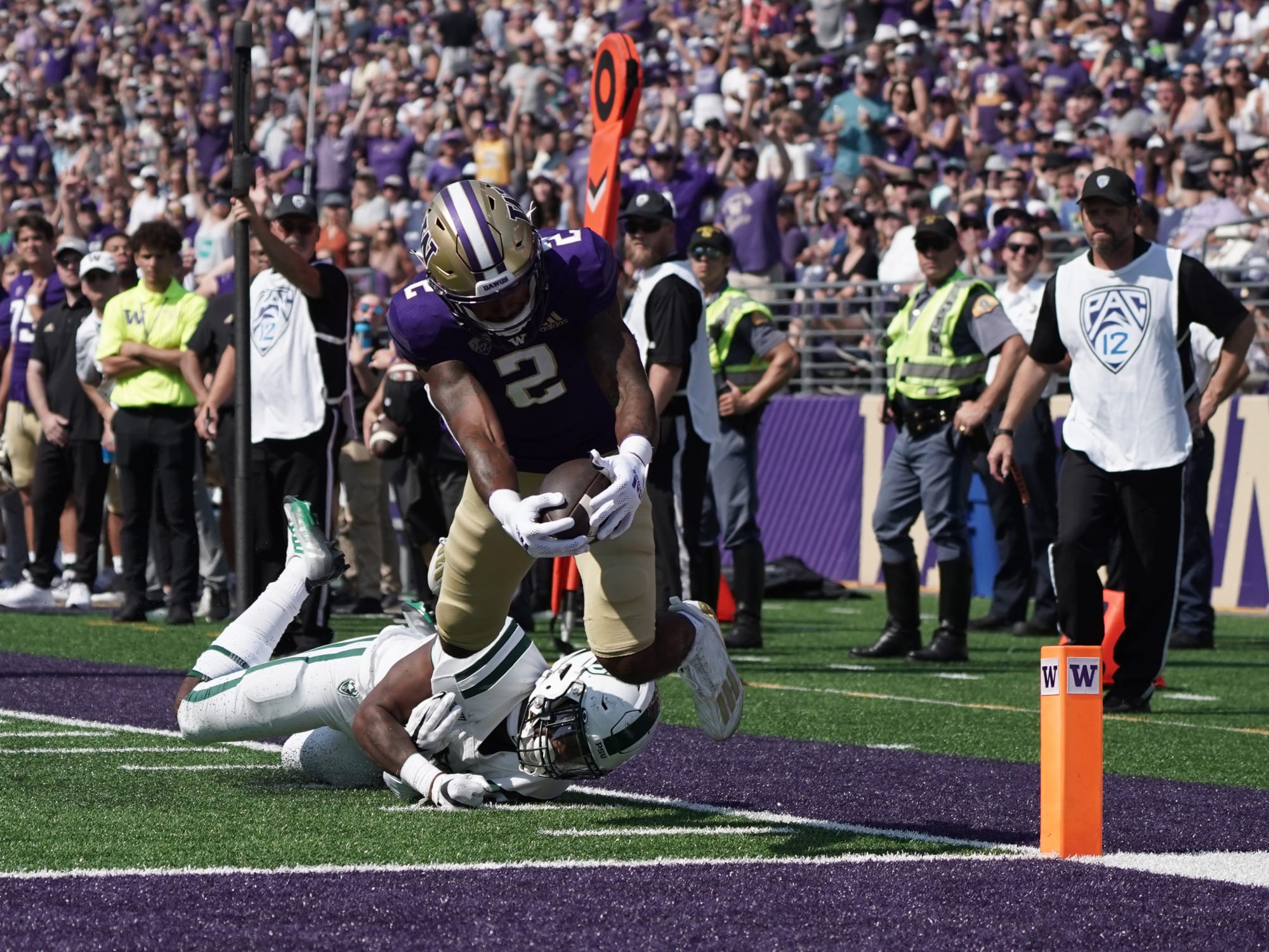 Getting around the corner, Ja'Lynn Polk finishes off his scoring catch against Portland State by plunging into the end zone.