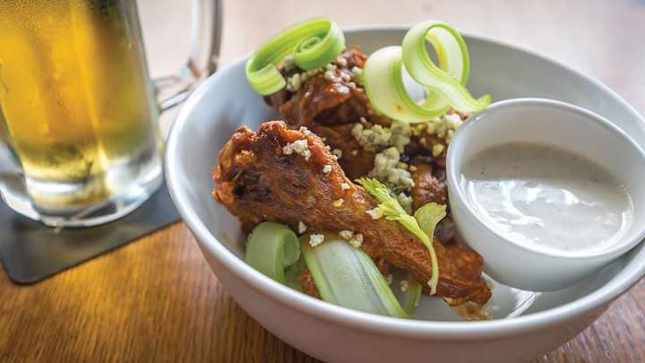 4. Add the wings to the sauce and toss well. Transfer the wings to a platter and top with crumbled blue cheese and celery ribbons. Serve hot.