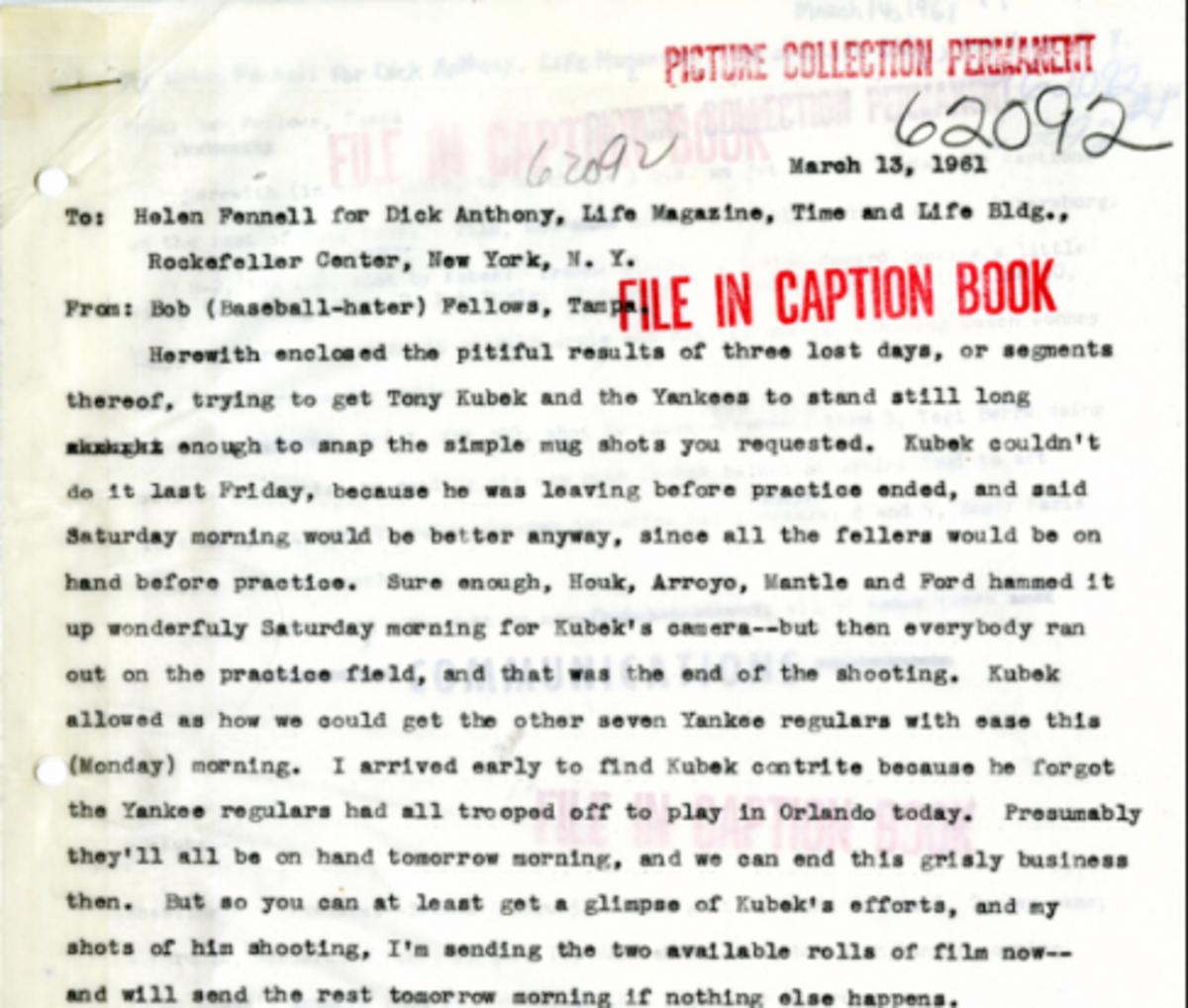 Part of a memo sent from Florida to the LIFE offices by Bob Fellows, a photographer who accompanied Kubek to spring training :: :: Tony Kubek—Time & Life Pictures/Getty Images