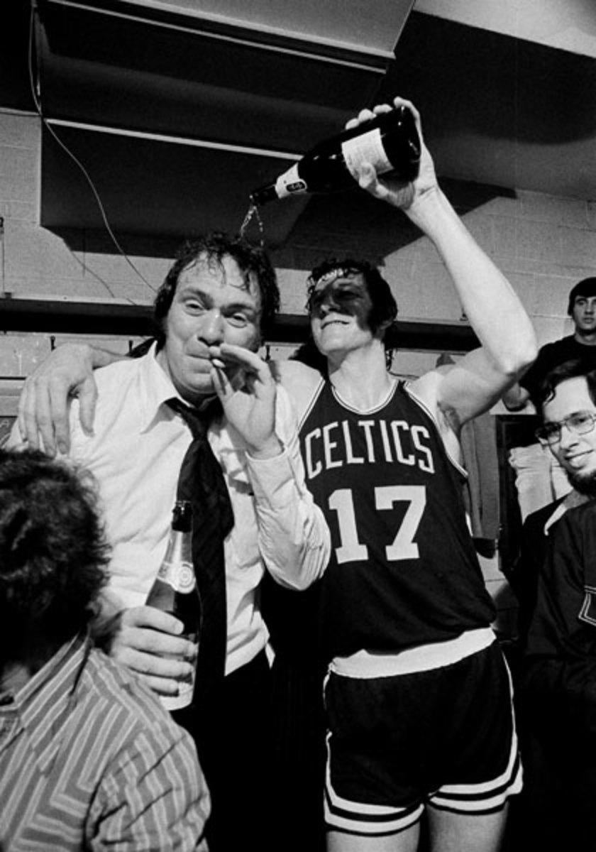 Nothing like a cigarette after a tough Game 7! Celtics coach Tommy Heinsohn puffs away as he receives a champagne bath from John Havlicek. Earlier that night, the Celtics claimed their 12th NBA Championship with a 102-87 victory in Milwaukee. The game occurred 40 years ago today. SI's Peter Carey describes the postgame celebration in the Celtics locker room: