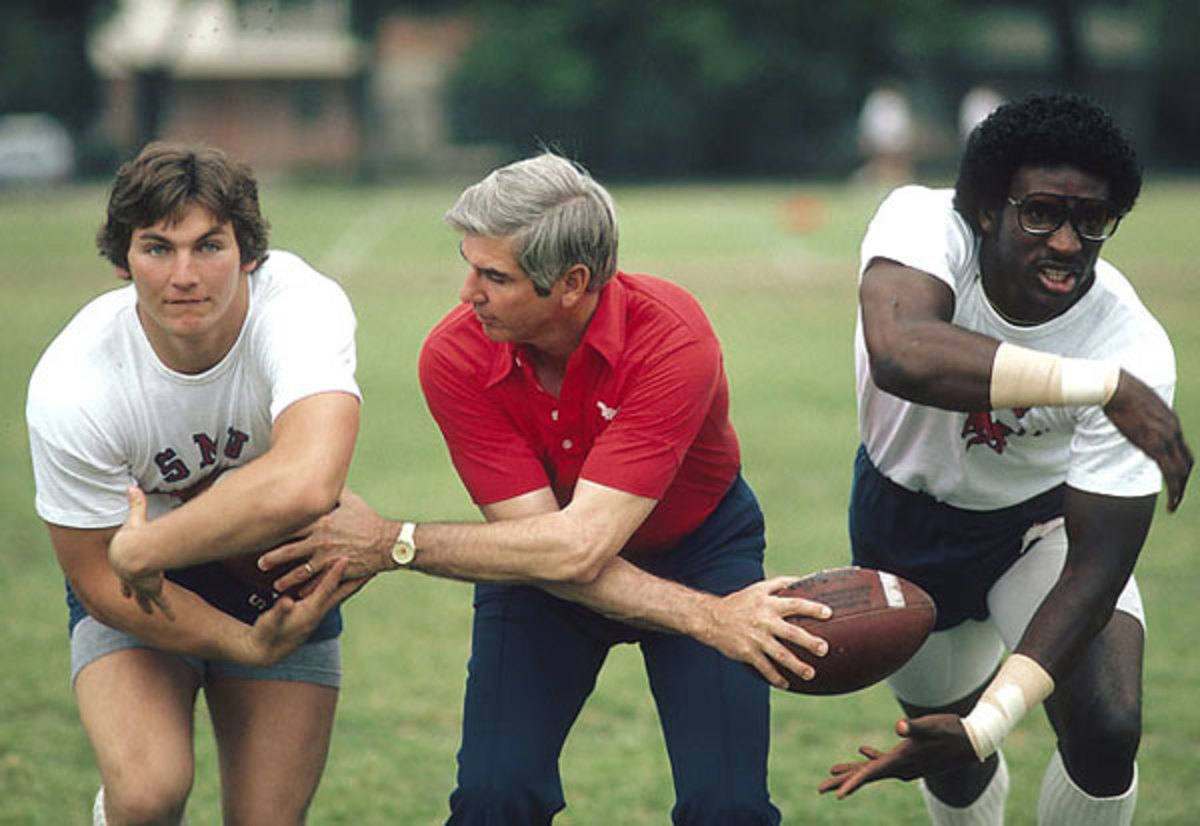 "It was a lot of fun recruiting them," says SMU offensive coordinator Steve Endicott. "Especially Eric. Every game was like a coaches' convention." There were Oklahoma's Barry Switzer and Texas' Freddie Akers and Texas A&M's Tom Wilson, all of whom were ready to promise Dickerson the world. James, on the other hand, wasn't much of a problem. He passed up baseball for football, largely, he says, because he wanted to prove that a white boy could still excel at running back in the Southwest Conference. "Everybody said that because I'm white, I couldn't compete," he says. "There was no doubt in my mind. I played on a state championship team just like Eric. People thought I was slow -- I have never been caught from behind." James committed himself to SMU during his senior season. The hard part was having to tell Bear Bryant to his face that he really preferred SMU over Alabama."