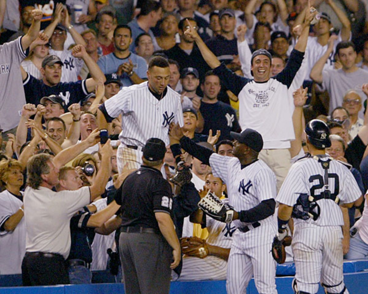 A bloody Derek Jeter heads back to the field after diving into the stands to catch a foul ball during a 2004 Red Sox-Yankees game. This is widely considered one of the best plays of Jeter's career. The Yankees captain made one of the worst plays of his career last night when he thought a fair ball hit by Seattle's Kyle Seager was foul and the mental gaffe led to a triple. For more classic sports photos, visit the SI Vault on Twitter.