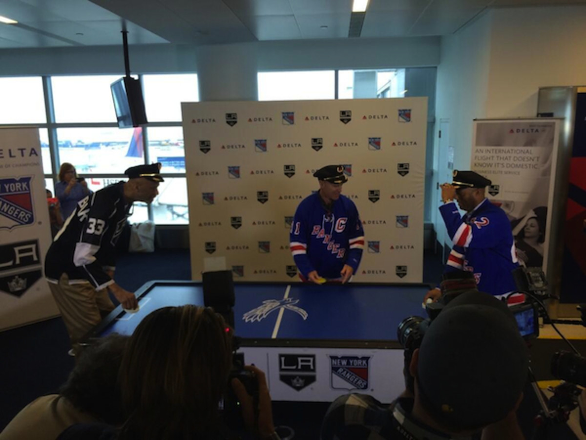 Turns out, Delta Air Lines sponsored the charity game with legends from Los Angeles and New York, a nod to the Stanley Cup Finals matchup. That's slightly disappointing because for a split-second I thought the greats might have crossed paths in Manhattan, talked some smack and settled their differences at an arcade. By the way, Rivera won the game 2-0, a fitting final score for a game involving Mo. (Maybe the team he's representing can protect a 2-0 lead tonight?)