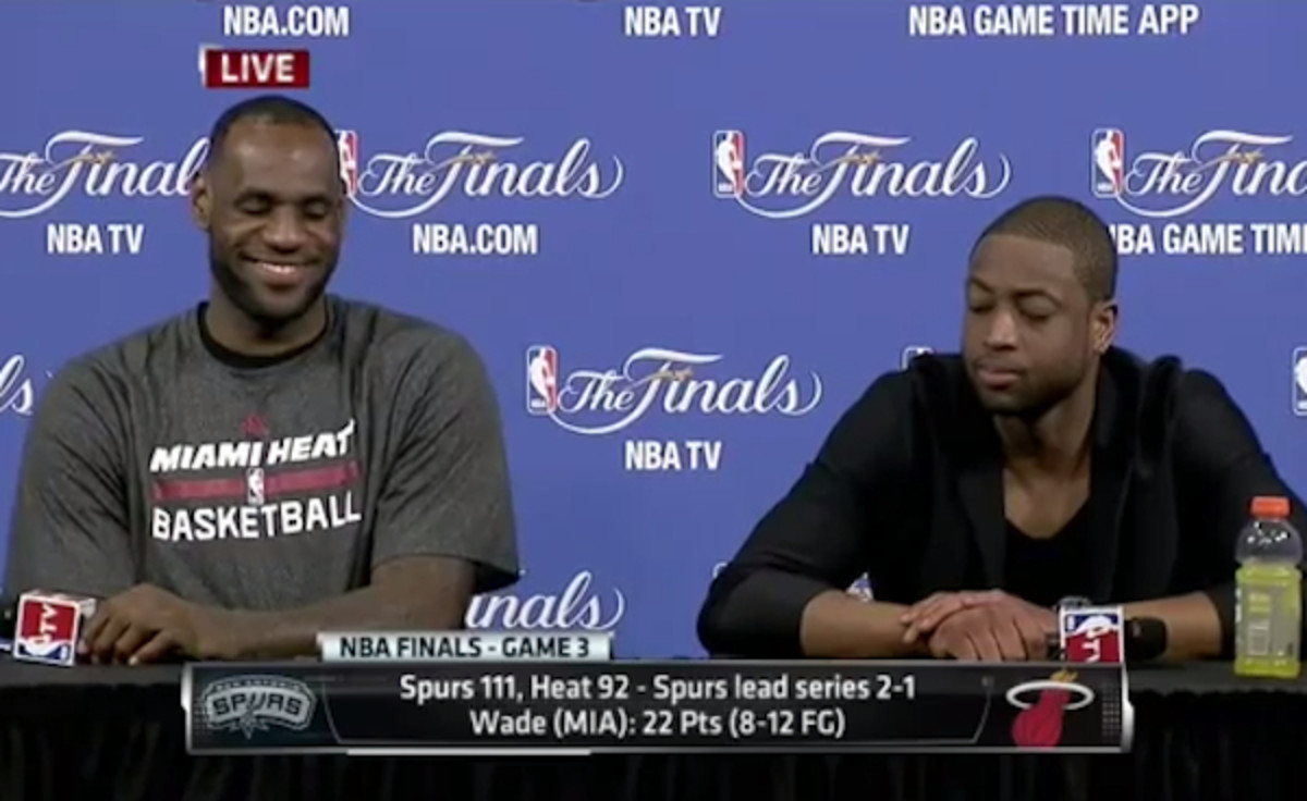 The best part the Spurs' 111-92 smackdown and otherworldly shooting performance last night (over 75% in the first half) came after the game. (Unless you're a Spurs fan, of course, or had some cheddar on San Antonio.) During the postgame press conferences, "Bobby Ramos" of Bottomline! uttered a meandering, undecipherable question for LeBron James and Dwyane Wade. Just watch.